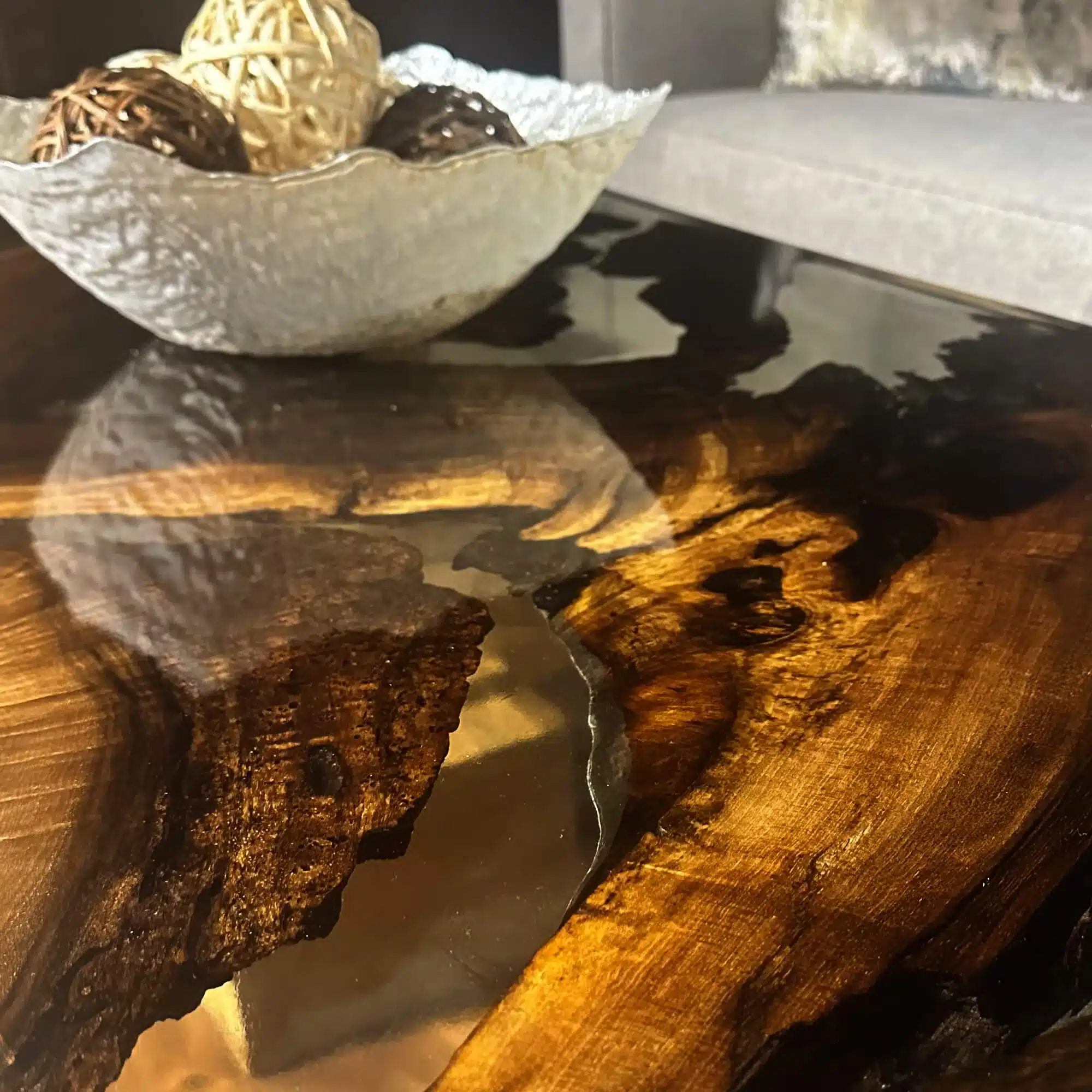 Our Ikiz Coffee Table features a surreal yet stunning epoxy resin design embedded into the coffee table. Shades of dark mocha and black with transparent parts create a dazzling look.